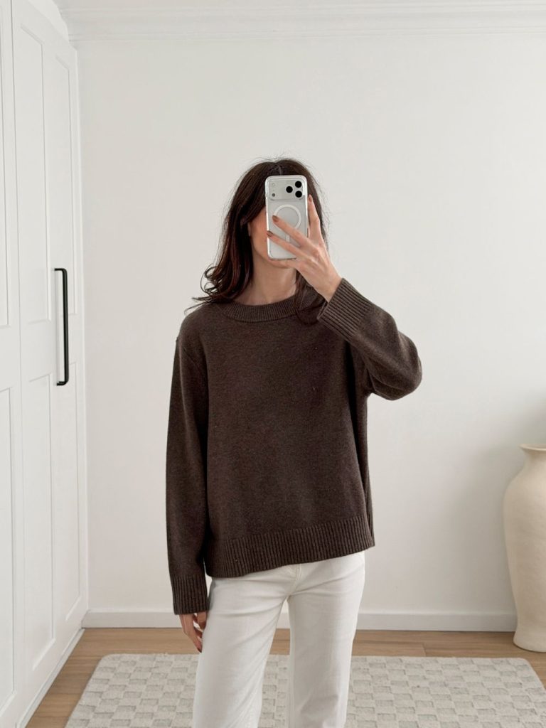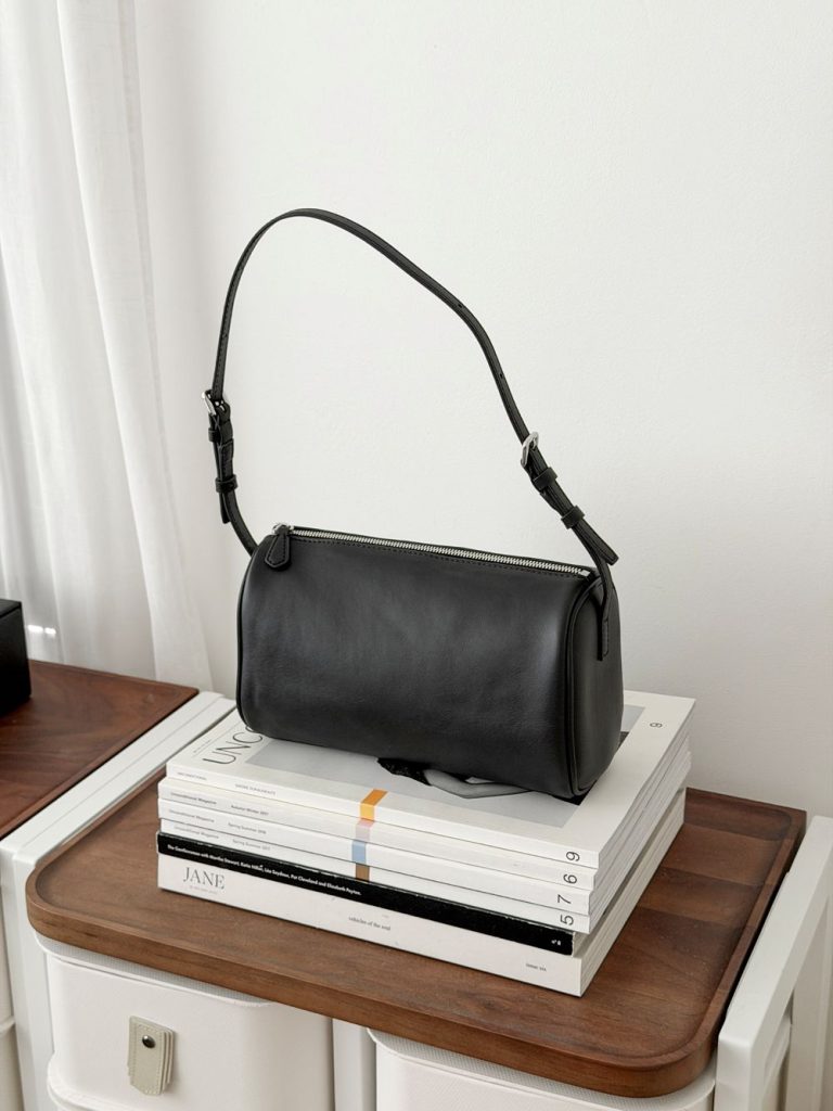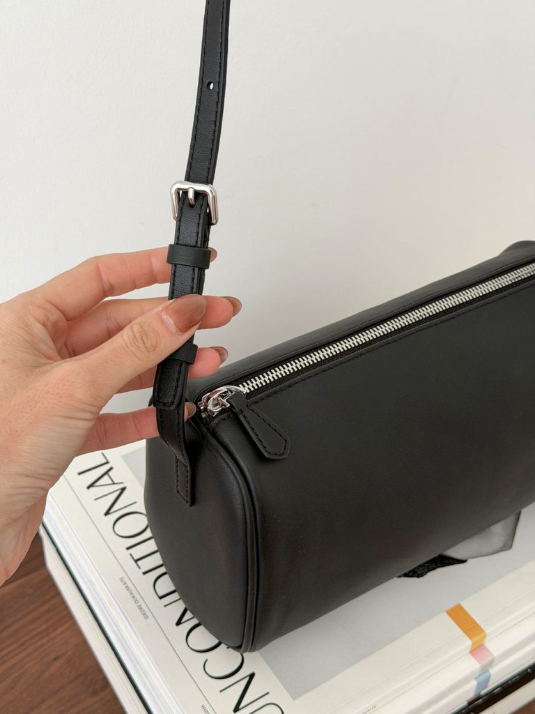 You’d be forgiven for thinking that the bag I was going to mention was this one here. Which I absolutely adore, and to date goes down as one of my best ever purchases from the brand. But, there’s a new kid on the block which I’ve been wearing on repeat and just had to share as I’m sure it’ll pique the interest of many of you. This little mini barrel bag; very reminiscent of The Row’s 90s bag, but at a fraction of the price. Coming in at just shy of $120 USD, the value for money is unrivalled. The smooth leather feels really beautiful, and has already started to soften up nicely, while the sueded interior gives the bag an unintended luxe boost. Hidden inside is a small zip up pouch attached to a leather strap which you can remove. Great for keeping those smaller essentials tucked away and secure. The zip up closure pulls smoothly, and it’s handy having the adjustable belt style strap as you can easily lengthen/shorten in a pinch. I have mine on the longest setting which comfortably fits over chunky knits and coats. Base of the bag is flat too – leaning into that minimal feel while being practical at the same time. Already eying it up in chocolate.