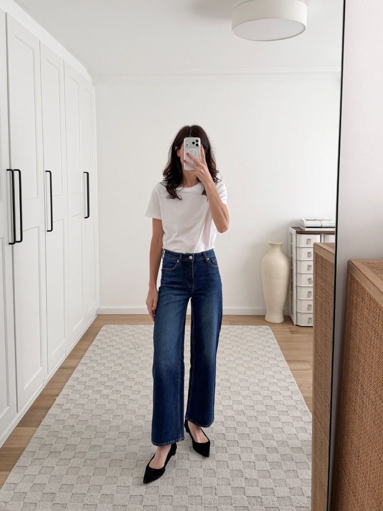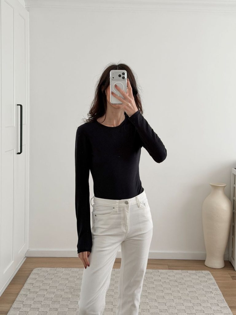 If you like a good “comfort stretch” jean, then Quince’s denim line up is worth taking a second look at. Of all the silhouettes, my personal favourite is the Bella straight style; universally flattering, and offered up in four different inseam options which makes you feel a little spoilt for choice. I’m wearing the colour “stormy blue” here, which is the perfect dark blue rinse with some subtle fading across the thigh. The denim itself has some sturdiness to it, but plenty of stretch so think of these as jeans you can actually move in. Perfect if you have young kids as they don’t restrict movement (IYKYK). I find they fit true to size. I stick to my usual denim size 26.