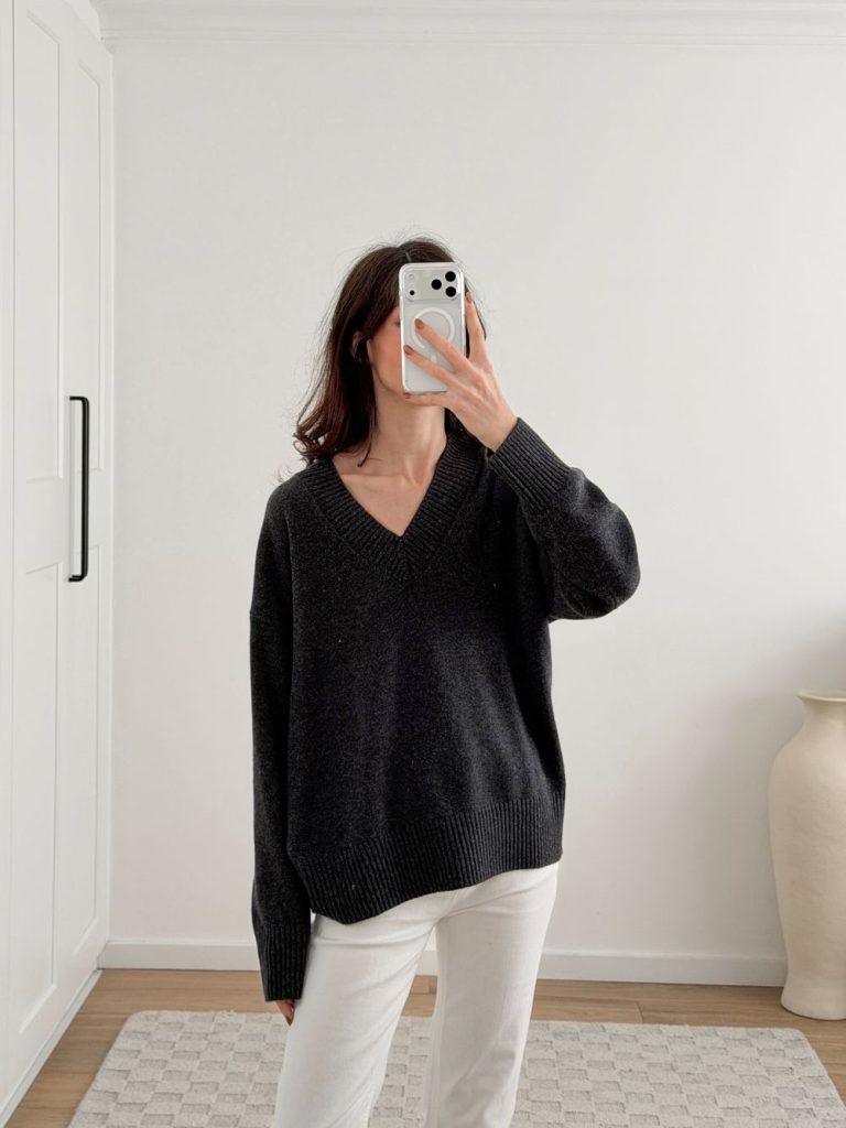 An underrated style I’ve not seen anyone talk about, this is a great sister style to the Oversized Cashmere Crew if you prefer a v-neckline. For comparison sake, the Oversized V-Neck Sweater runs a little longer through the body, covering the bum so it’s a good option to style alone with leggings. Also works really well tucked into denim or trousers as the knit isn’t too chunky. The cashmere is really beautiful, and the thick ribbed trim at the collar is a nice added detail. Fits true to size for a relaxed fit; I would recommend sizing down for petites.